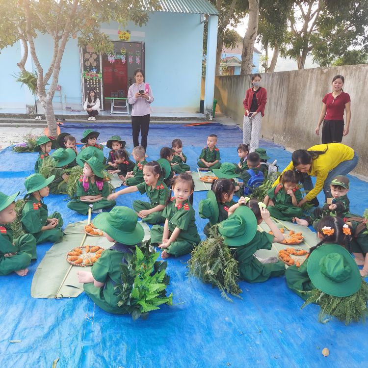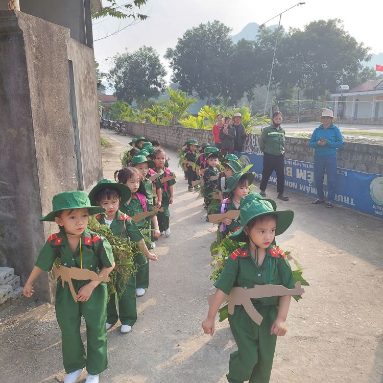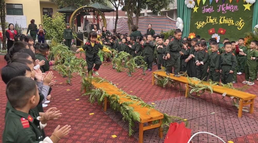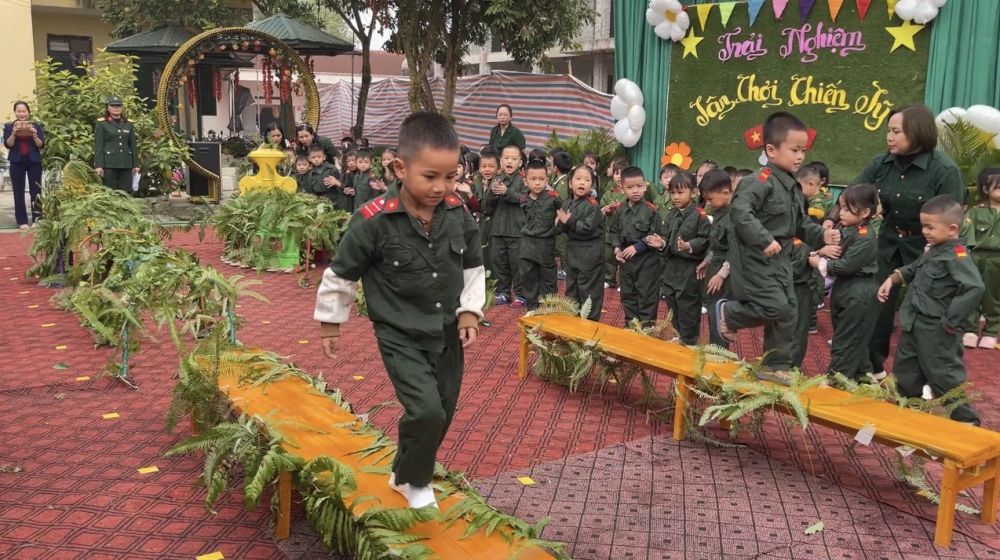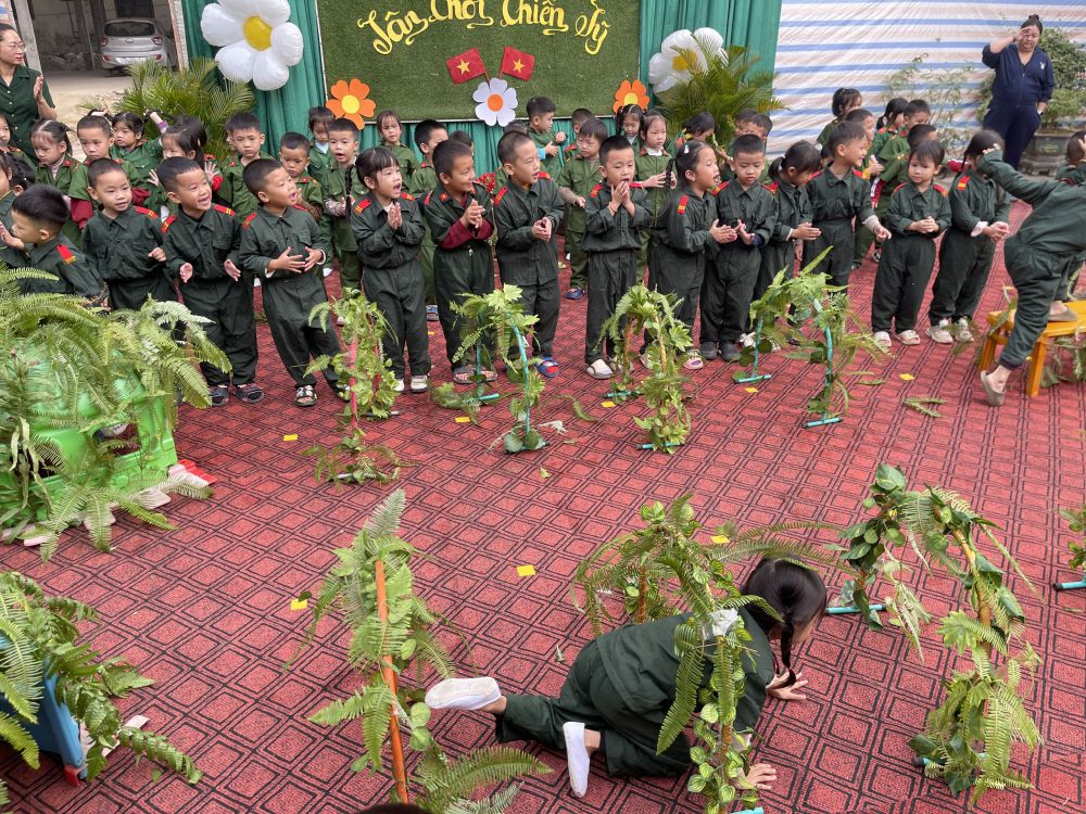 3. "Chiến sĩ giỏi": Bản lĩnh và quyết tâm Phần mong chờ nhất chính là trò chơi vận động liên hoàn mang tên “Lá cờ chiến thắng”. Tại đây, các chiến sĩ phải vượt qua một "trận địa" giả định đầy thử thách: • Chui qua các lùm cây rậm rạp. • Vượt cầu băng qua sông. • Leo núi cao để cắm cờ. Dưới sự cổ vũ nồng nhiệt, các tiểu đội đã thi đấu hết mình với tinh thần "thắng không kiêu, bại không nản". Từng lượt chơi trôi qua trong tiếng hò reo, mỗi lá cờ được cắm lên là một minh chứng cho sự nhanh nhẹn, khéo léo và lòng dũng cảm của các bé.